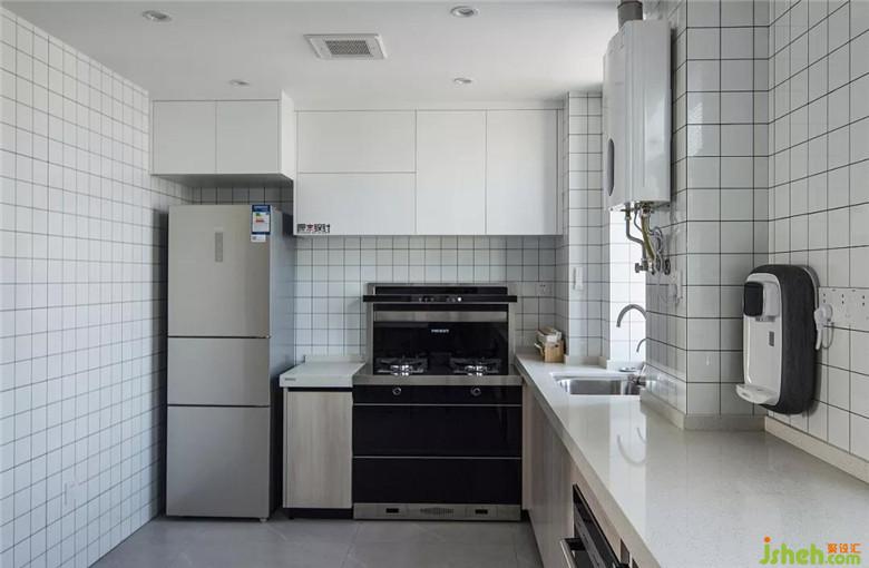 厨房的超大橱柜收纳功能齐全。亚光烤漆的吊柜搭配浅木色的地柜,装修公司搭配上墙面的小白砖,整体氛围清爽而自然,表达出生活贴近自然的理念。