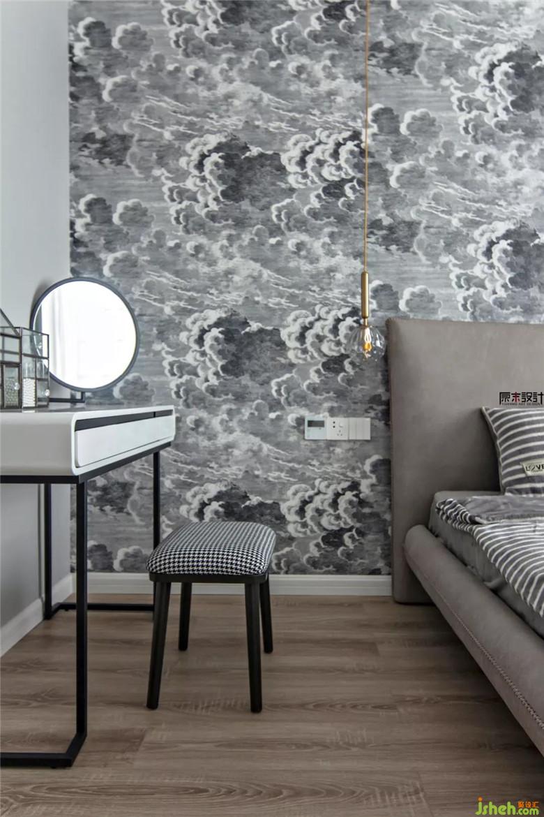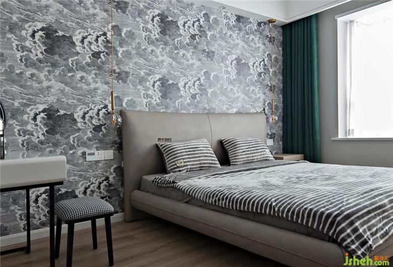 主卧装修公司采用网红云墙纸铺贴增加了卧室的神秘感,搭配上床品的点缀提升了空间层次和质感。