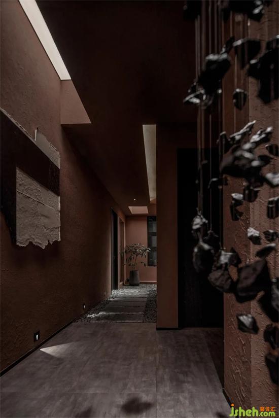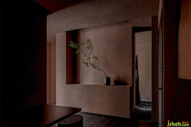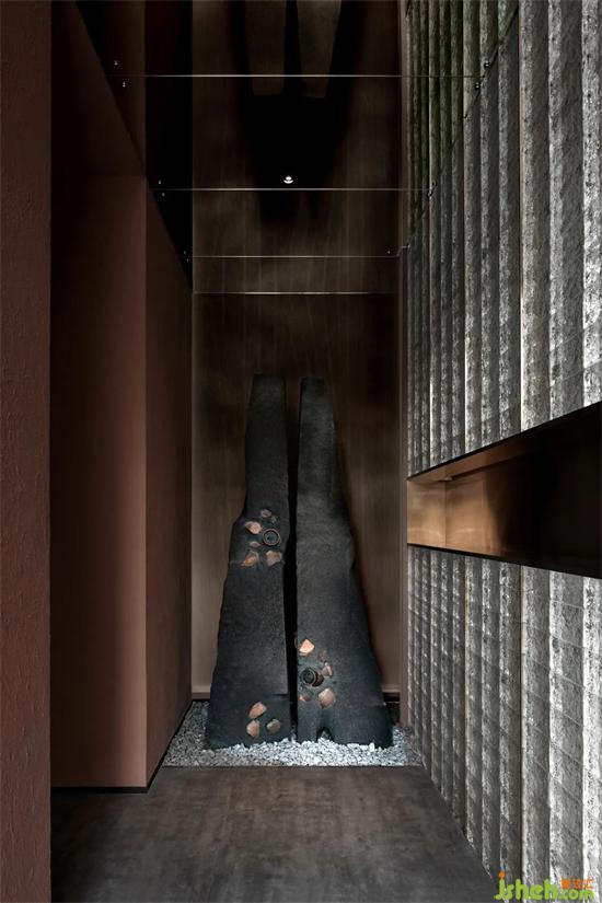 入口的端景,是一块从中间劈开的石块,述说着盘古开天辟地的传奇故事。左边的夯土墙,地面的碎石,似乎带酒馆设计我们来到那个远古的时代,那是文明的起源,人类智慧的开始。