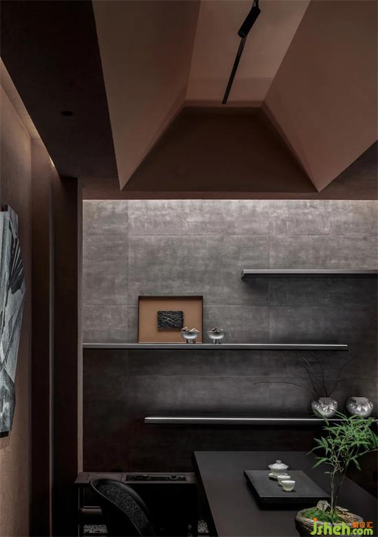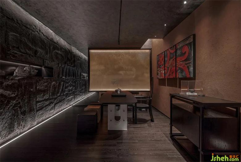秦以黑为尊,秦人崇尚黑色,这与五行说有关。五行认为周乃火德,秦是水德,水德灭火。我们将空间二楼最大的包厢命名为“秦”,引入黑色调,酒馆设计将其分为圆桌区和茶酒区,可以容纳足足十六人,宛若谱写着秦时的雄图伟业。