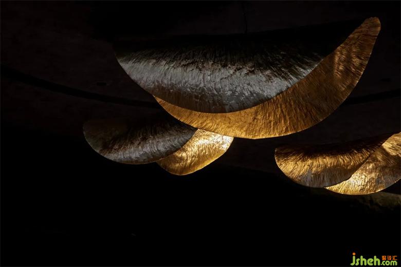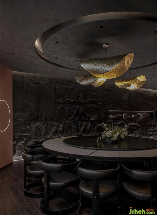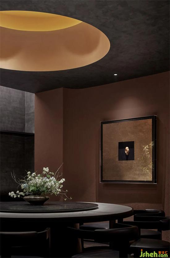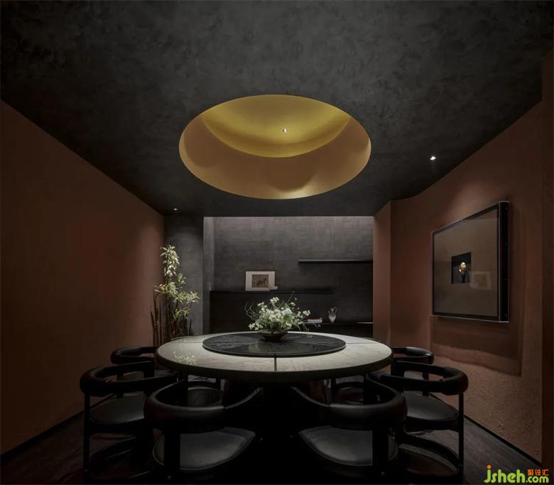 天圆地方,是古代的哲学思想,也是对天酒馆设计之道、地之道、万物之道的深层思考和讨论,在建筑空间的各处我们都有体现这个思想。在建筑二楼我们分别设秦、唐、汉三个包厢,每个包厢都遵循了天圆地方这个思想,在顶部设计了圆形吊顶。