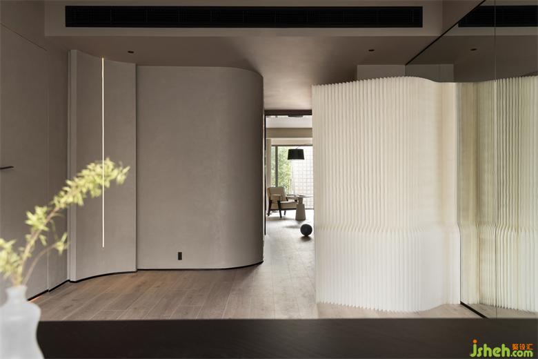 重新规划室内设计师的空间,由过道相连,贯穿这一侧的起居室,与另一端的茶室。原本的弧形墙面被拉平,保留了更坚定内敛的形态,一道圆形的光划过墙面,在空间中荡起层层涟漪。