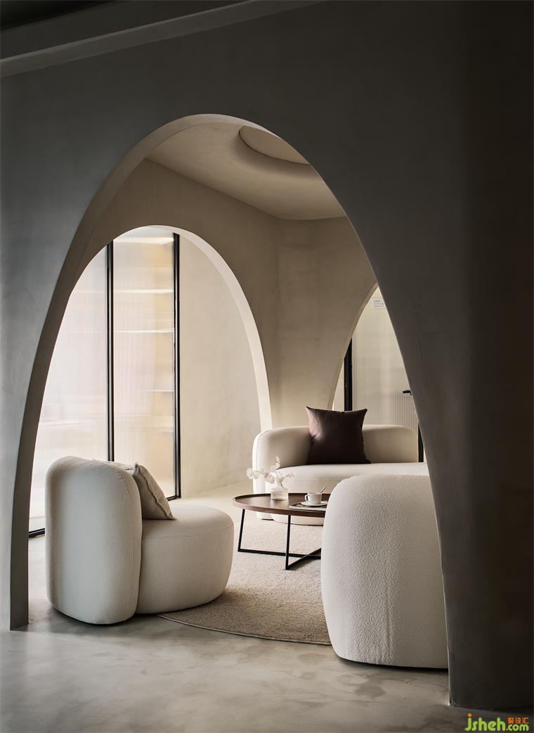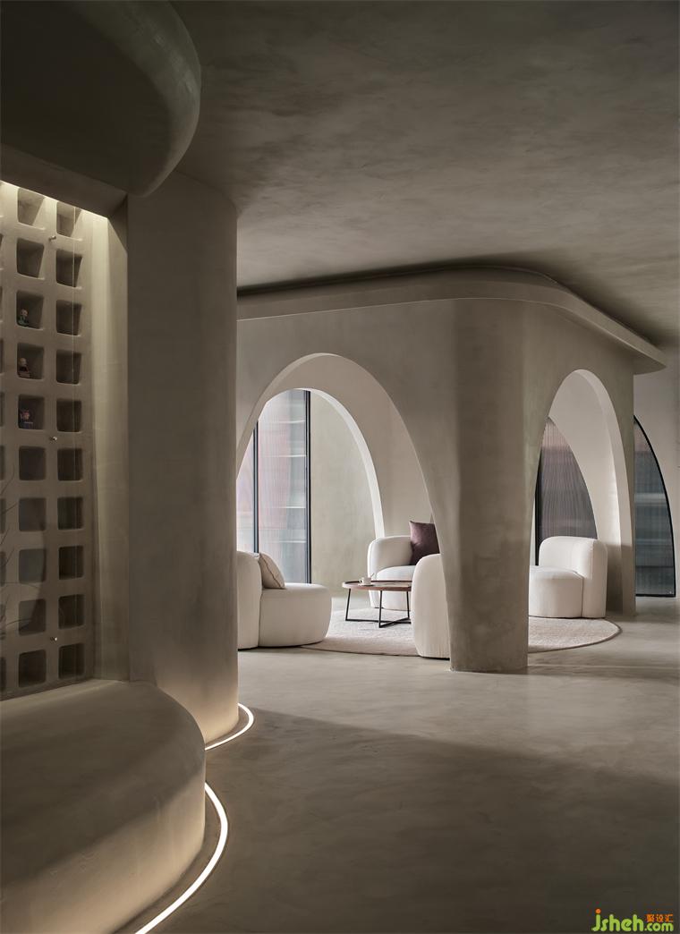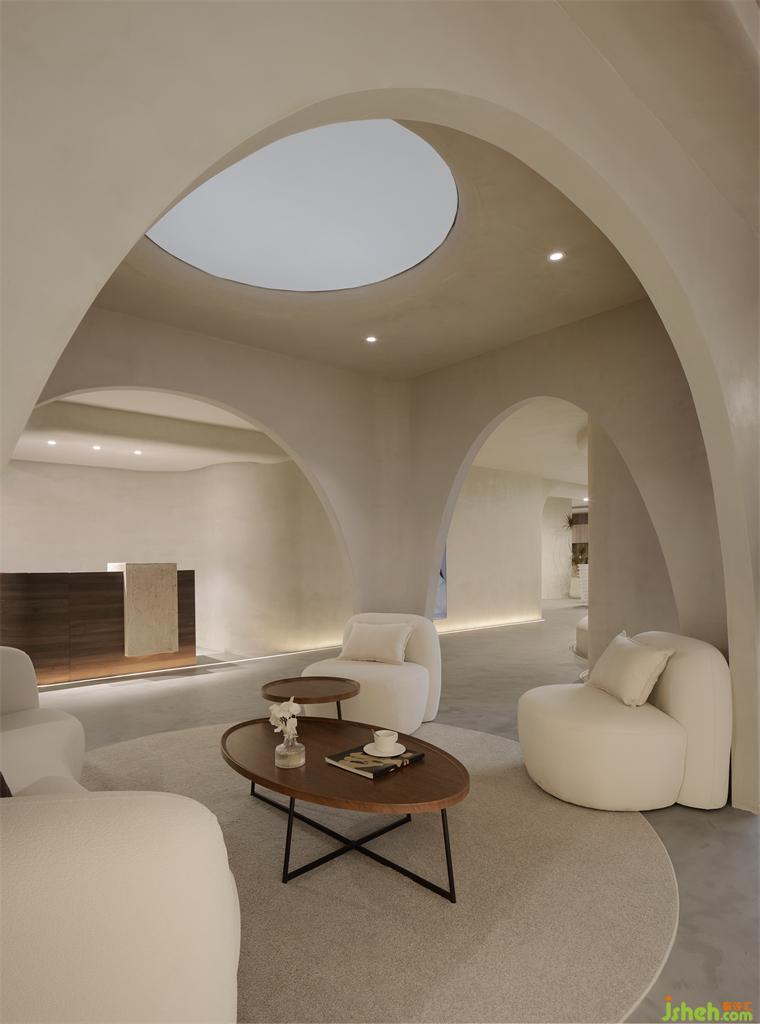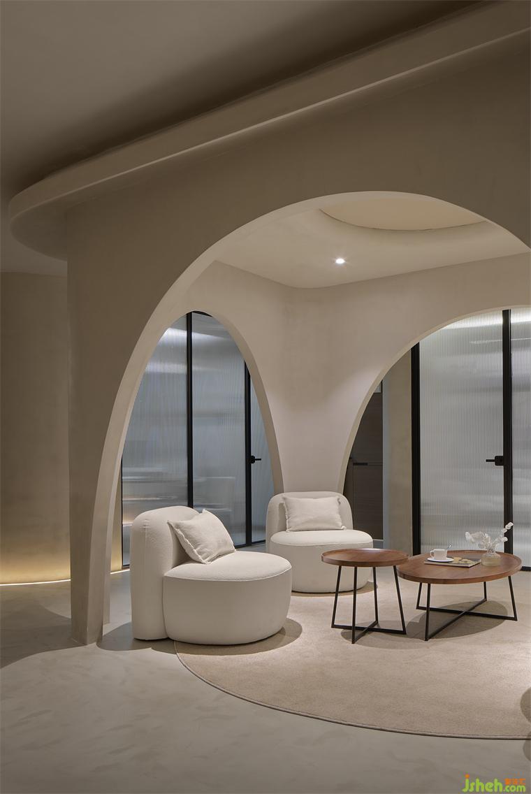 在公共空间区域,为了同时考虑空间的私密性与格局的流动性,医美空间设计师机智采用了弧形的隔墙。同时,顶面与墙面转角都以弧面形式呈现,这种开放式形态将环境与墙体建筑的天然优势最大化。