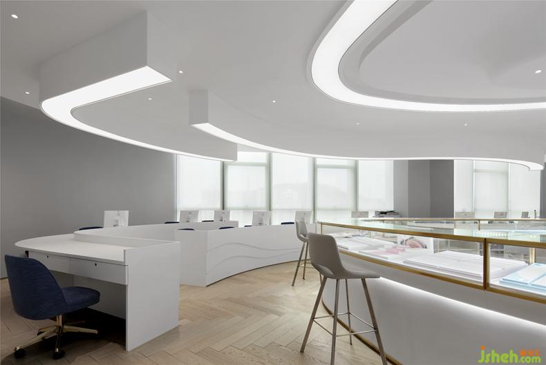 本案的珠宝展厅位于水贝银座珠宝城,兼具展示、接待及办公功能,室内设计师的灵感来源于宝石的形态以及女性的柔美,韵律流畅的线条为展厅赋予了前卫时尚的格调,同时以不同质感纯净的白为空间底色,烟粉、明黄、宝蓝等点缀其中,打造梦幻轻奢的气质空间。