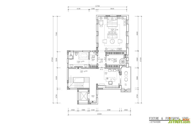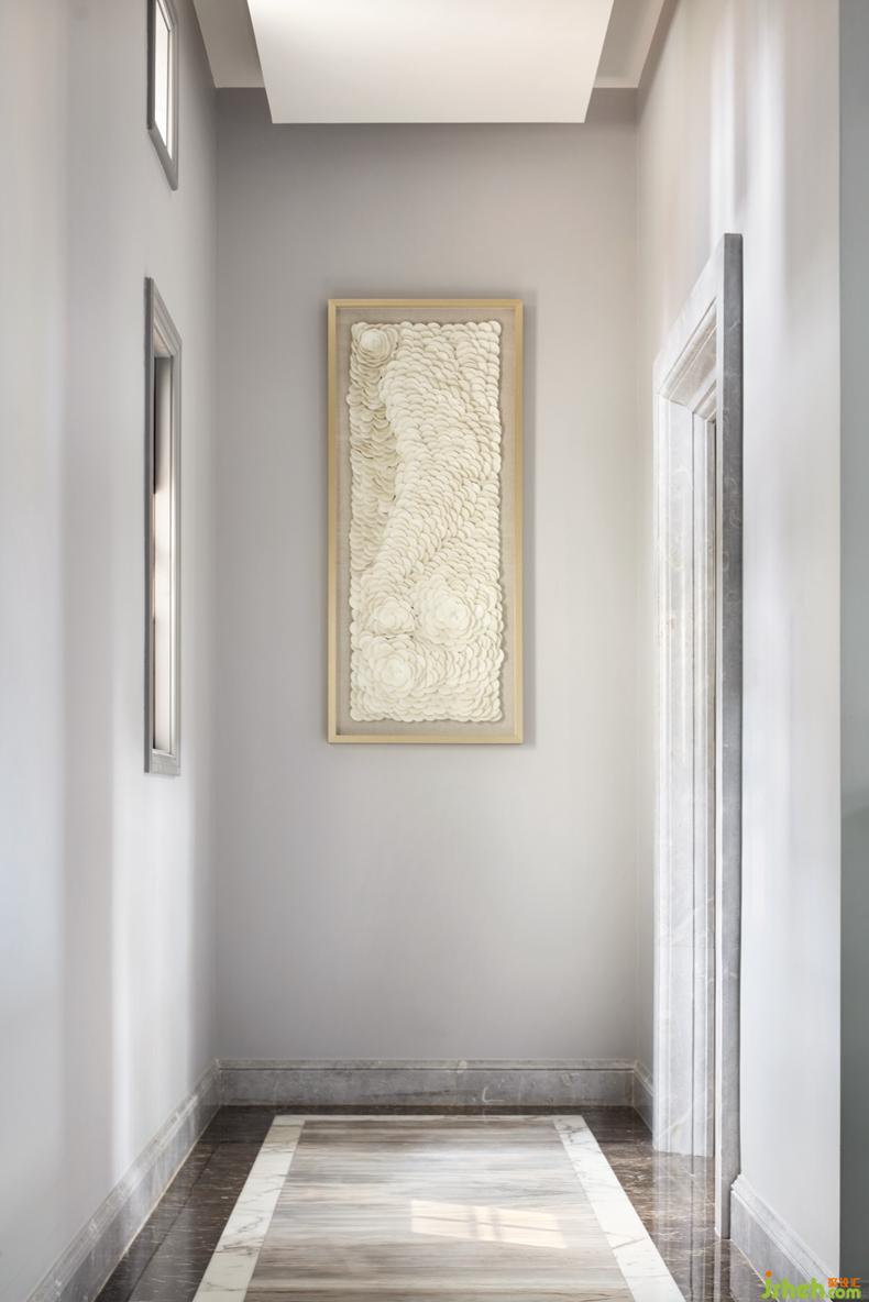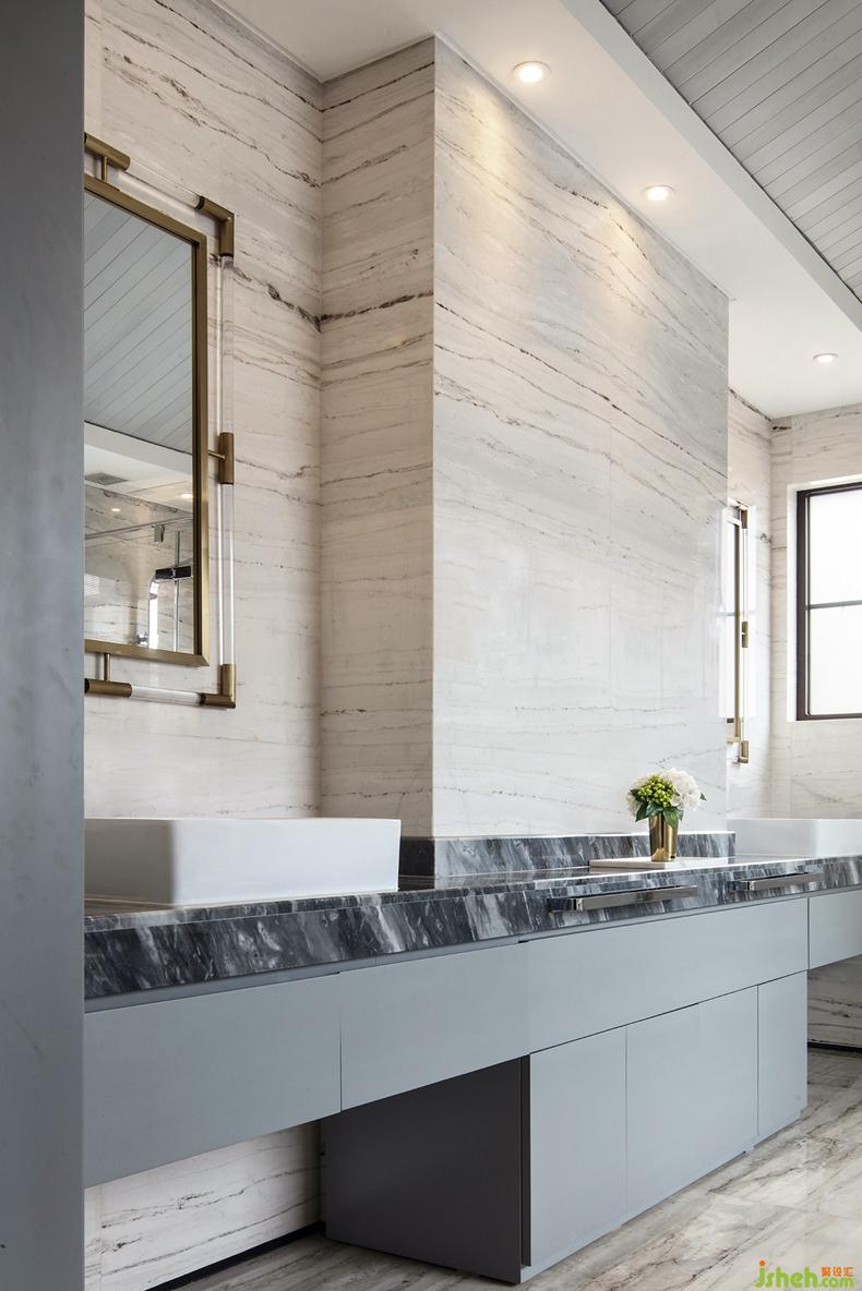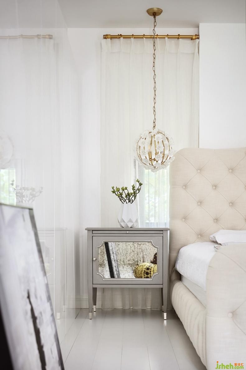 主卧室对称式构图与人字形天花设计,体现出了东方的平衡与稳定之美,大面积低饱和度的米灰色墙布,柔和的灯光,儒雅现代的家具形态,烘托出安静和谐的氛围。