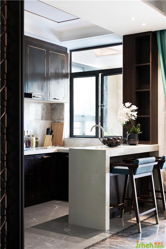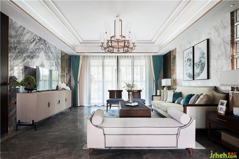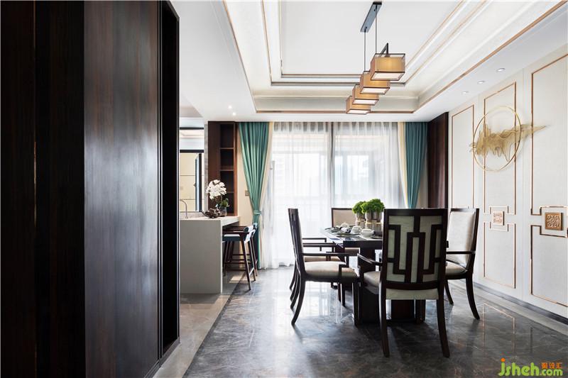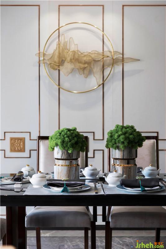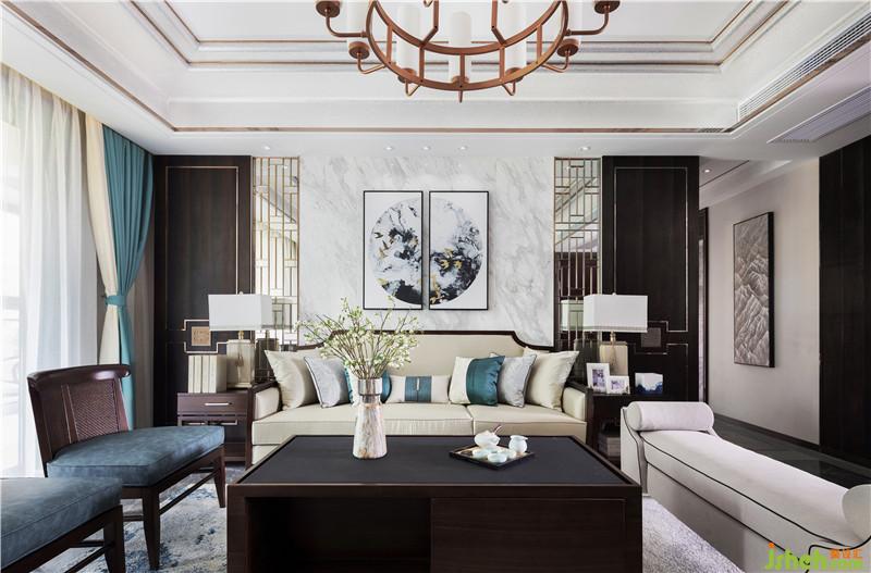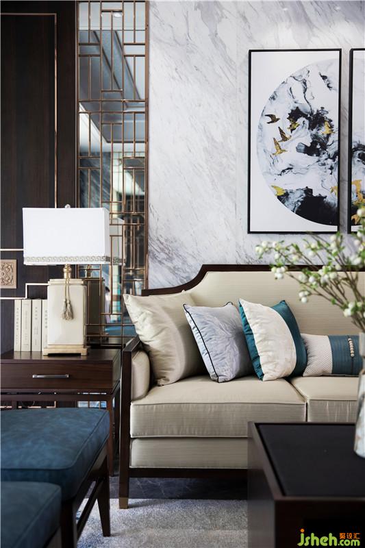 色彩说明:家具以深胡桃木色、香槟金色为主色调,整体空间加入些许雾蓝、水绿、钢灰,水墨色。宁静而致远,极具东方意蕴。色块分明又极具中国风挂画,延续着高贵的灵魂与中国千百年来的传统文化内涵,这些元素融合在一起,似乎将整个空间打造成了一 幅巨大的禅意山水画。