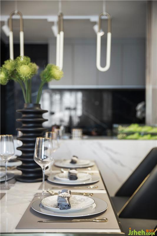 取其精髓,打造轻奢主义风格,不限制于任何装修元素与色彩。本案中运用姜黄色、魅影黑、翠绿色、太妃糖色,古沙色、水晶玫瑰色,纵横交错于爵士白大理石、干邑色金属条各种触感的材质里。家具使用黑檀木皮、按树瘤木皮多层处理,布艺黑灰色千鸟格纹,饰品物料烤瓷白、爵士白大理石、黑金沙大理石,经过各种丰富材质自行创新,让空间氛围更加多元化。摒弃了过多的约束,摆脱了沉闷的装修格局,让空间更加开放。
