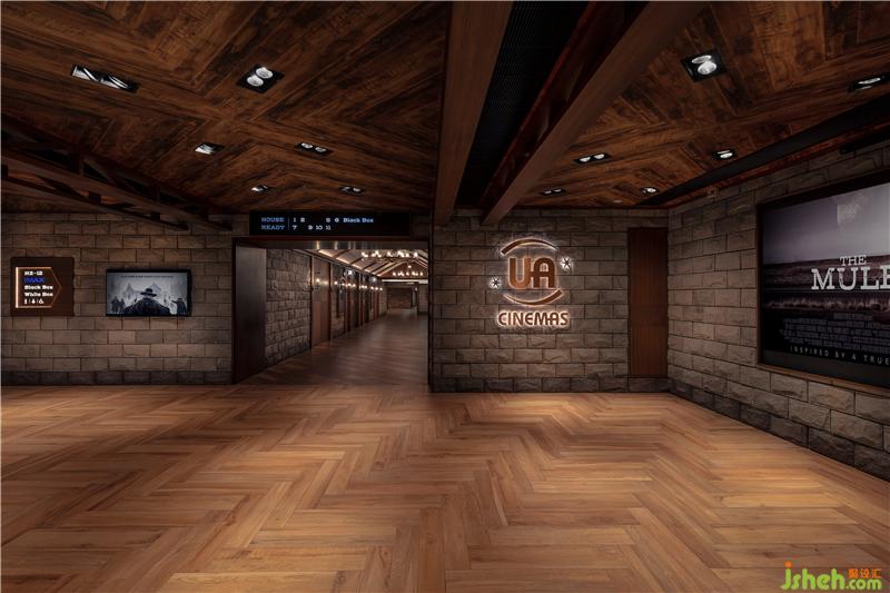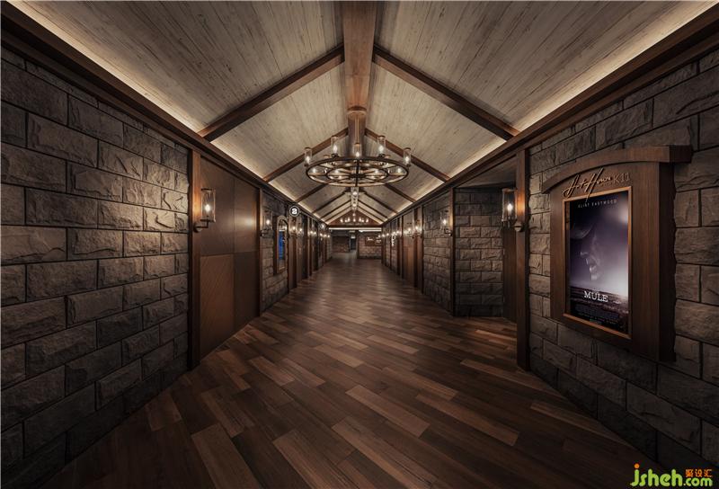 连接大堂、走廊、酒吧及影厅的走廊,采用山居建筑的阔屋檐担当空间骨骼,大量天然纹理木材及天然石,充斥时间的粗粝感,OFT用重复建筑元素,把原本无关的物质组合、拼接,形成一个整体空间,在新的感官平衡中,完成对人文与自然的重塑。电影院设计