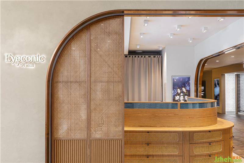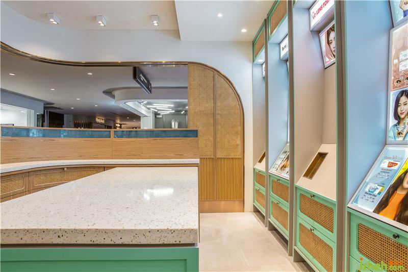 虽然店铺空间狭小,但恰好位于转角处,设计师把转角位置全部打开,不设常规玻璃门,而是与商场公共走廊直接联通,形成一个大开大合的空间,墙面转角利用弧形缓和直线条的生硬,提升空间整体性。