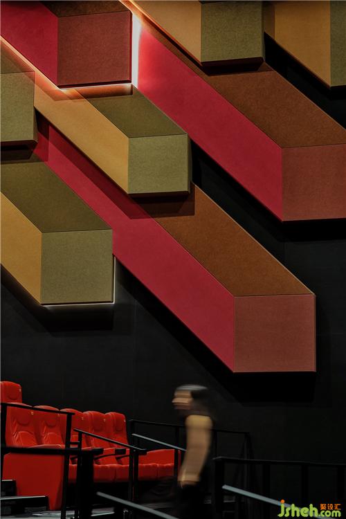 设计师以单一、简洁的马赛克,拼贴出丰富、生动的立体墙面,香港电影院设计完成像素由简单到繁复画面的呈现。前后凹凸效果,引出富有立体感的特色墙体,在光影暗合中带领观众进入沉浸式情境体验中。
