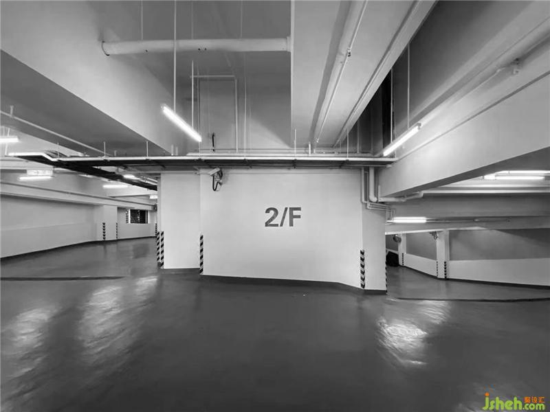 改造前:大面积的灰色地坪漆,易产生视觉疲劳,且地面车行划线不清晰,导致车辆在车库中迷失。