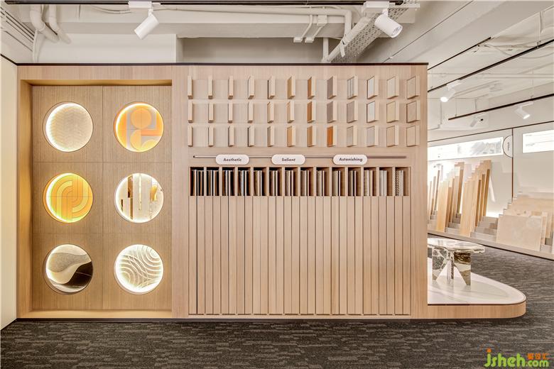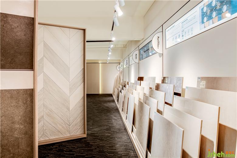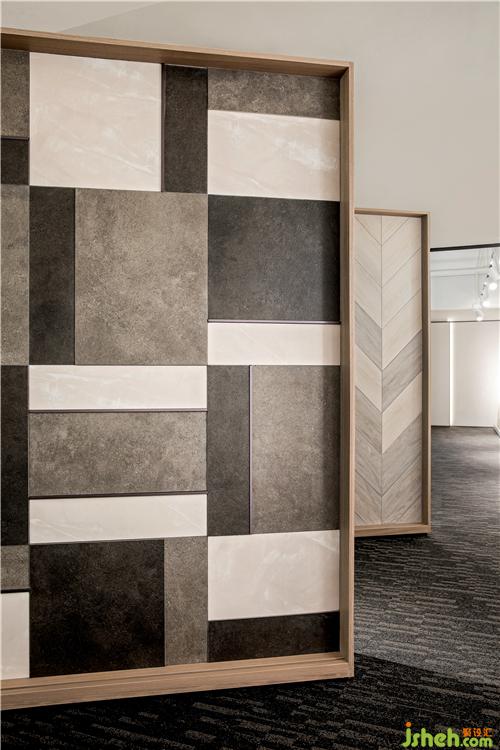 瓷砖展厅设计师还为尺寸较小的瓷砖构建瓷砖“书架”,这样样板就可以像书籍一样,被整齐地陈列在展架上,只要走近,就能仔细观察、阅读、触摸它的颜色、图案和肌理;