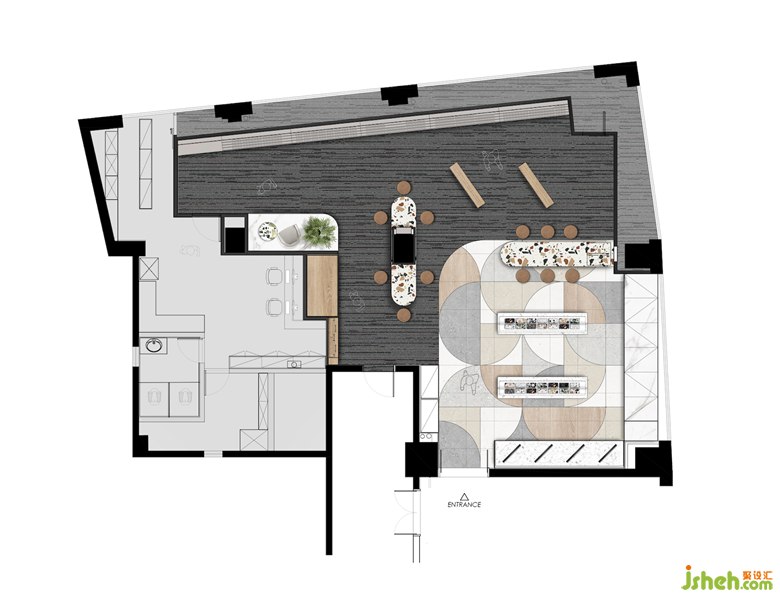 除此之外,设计师还深谙水满则溢的原理,在空间中搭配其他材料,墙面配以温润的原木,地面则地毯与瓷砖进行划分,就像玩俄罗斯方块一样,集结不同材料、尺寸、形状的材料,完成这次系统性的设计尝试,也让消费者在这个空间中轻松呼吸。