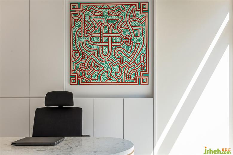此外,墙上还挂着1980年代美国街头绘画艺术家和社会运动者凯斯·哈林(Keith Haring)的涂鸦作品,浓厚波普艺术风格为办公室带来更具活力的视觉元素。