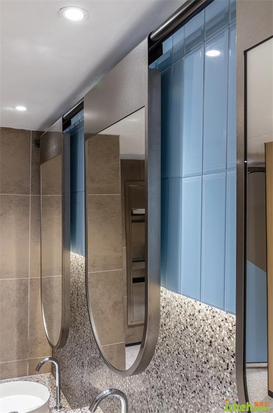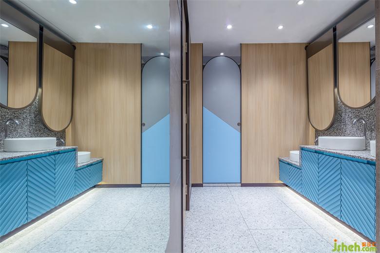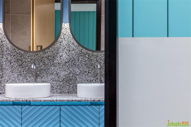 从湖水蓝到天空蓝,设计师在卫生间完成相同视觉之间的自然过渡,悬空镜面像窗帘一样垂下,让封闭空间变得灵动,仿佛有风吹过就会随风而动。