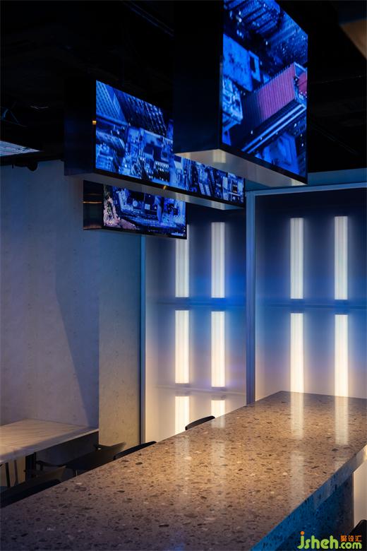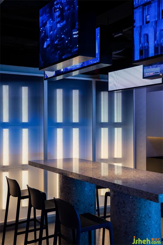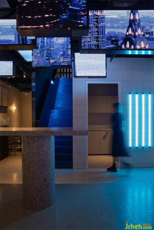悬置于顶部的LED电子屏上以现代城市街景为主题,代替天花设计,酒吧设计师希望通过从天而降的屏幕,重新解构城市、空间与人的关系,用设计回应社区更新的议题,同时可替换的内容有助于构建品牌文化,吸引志趣相投的年轻群体。