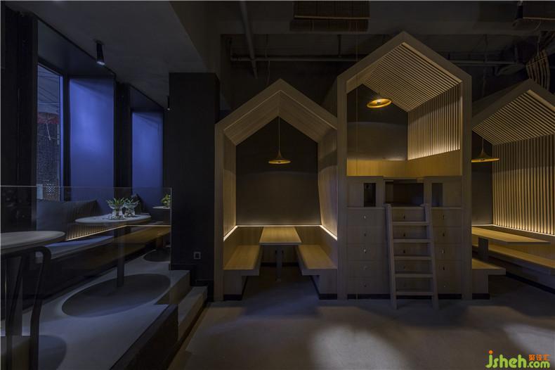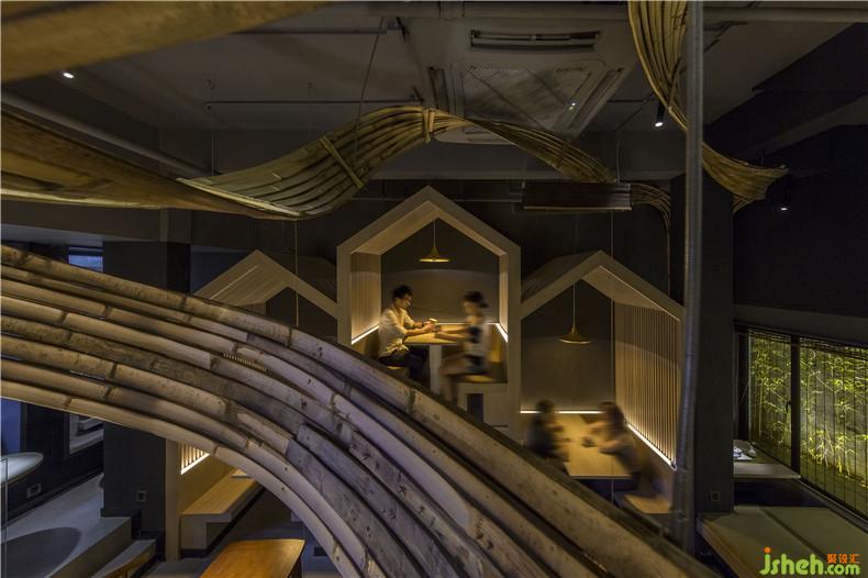 Designers in a narrow space to create a different space experience, different tea partition, with a different experience, a person is tea and tea dialogue, two people drink tea, is the exchange of people, There is a card position, the height of the hut, tatami, and further meet the people's privacy requirements. And clever use of buildings between the narrow, creating water view bamboo.