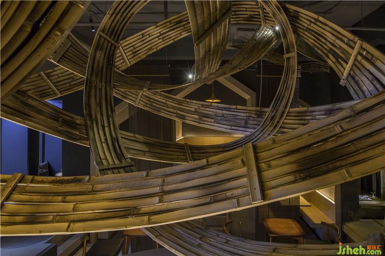 用中国传统的草书作蓝本,用竹片作墨,在空间挥写,形成独特的空间装置艺术,粗矿而张扬,以木格栅的直线条与之形成曲与直的强烈的对比,显得空间有更丰富层次感和节奏感。