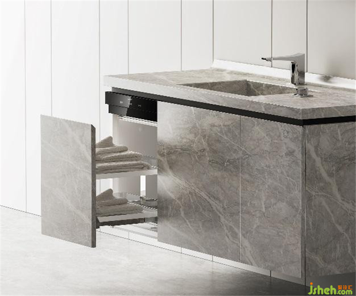 △图片五、六︰HANSO 汉宋智能浴室柜演绎了现代的生活方式和技术--冰箱模块用于存放护肤产品,恒温模块用于消毒和加温。