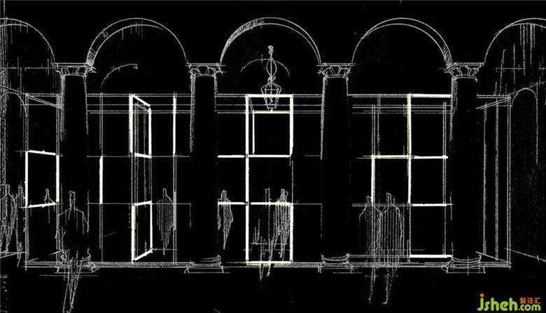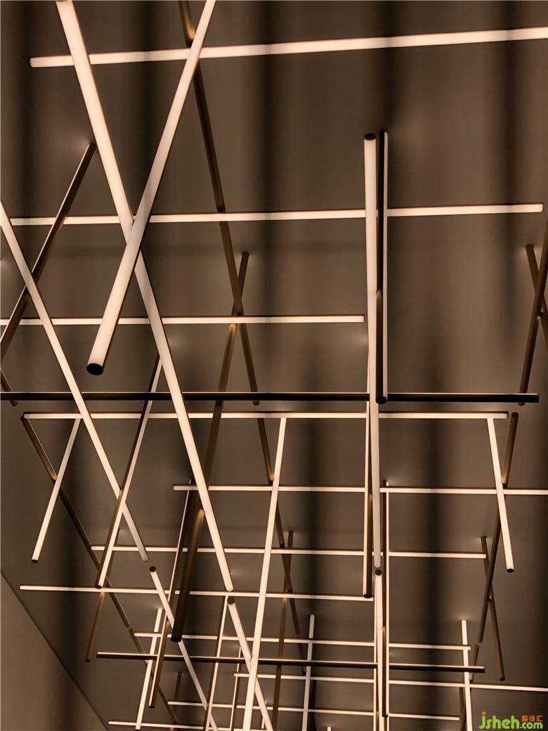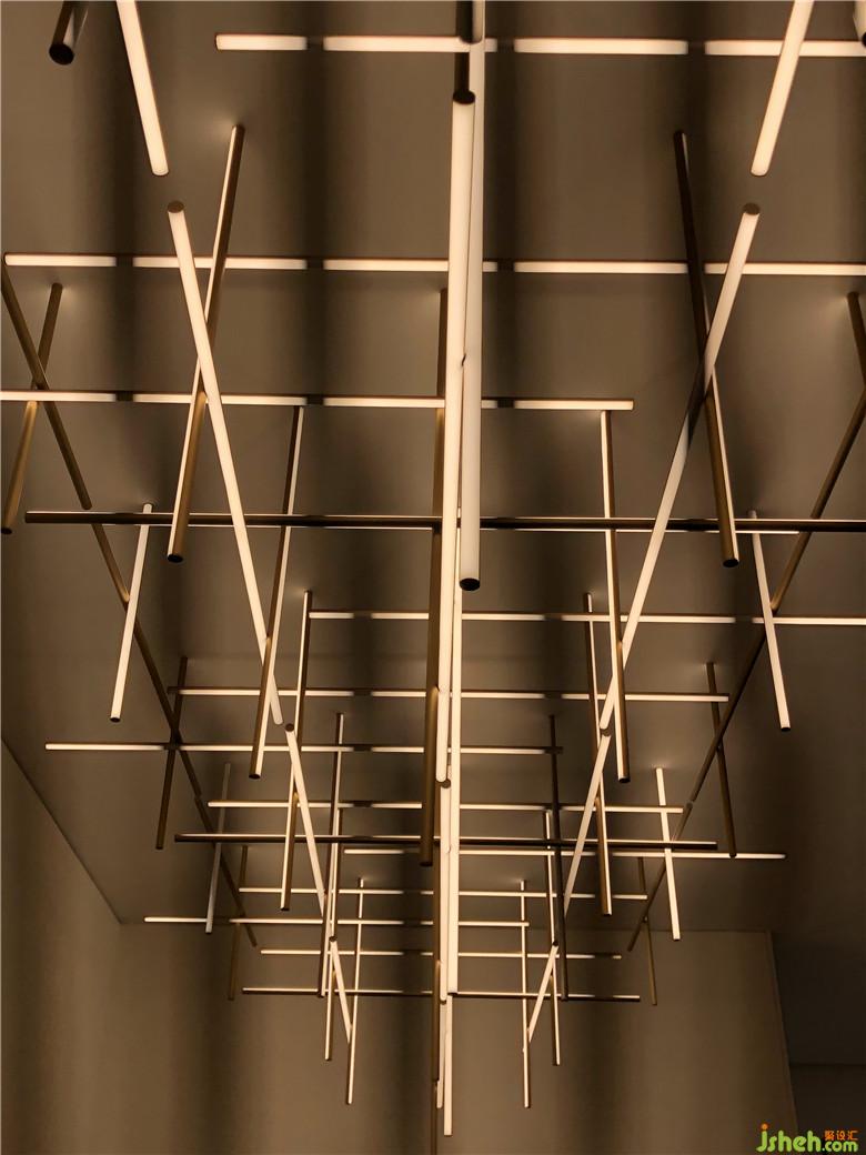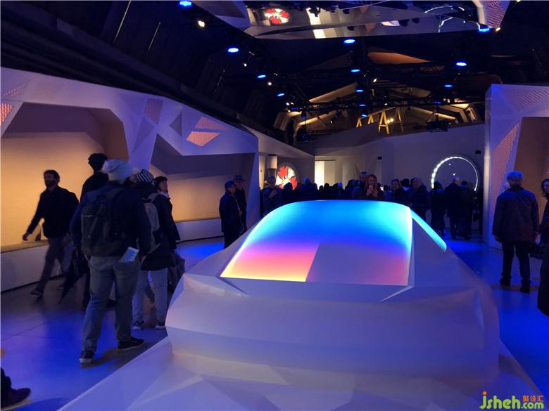 主题空间场景“曝光”,是一组由薄圆柱组成的发光装置。将多根圆柱在空间中组合成一个形体,每根薄圆柱上都有几种色彩,场景的主题随着色彩和音乐的转变而切换,空间与物体的对应关系也随着光线的转变而切换,整个设计把声和光完美结合。