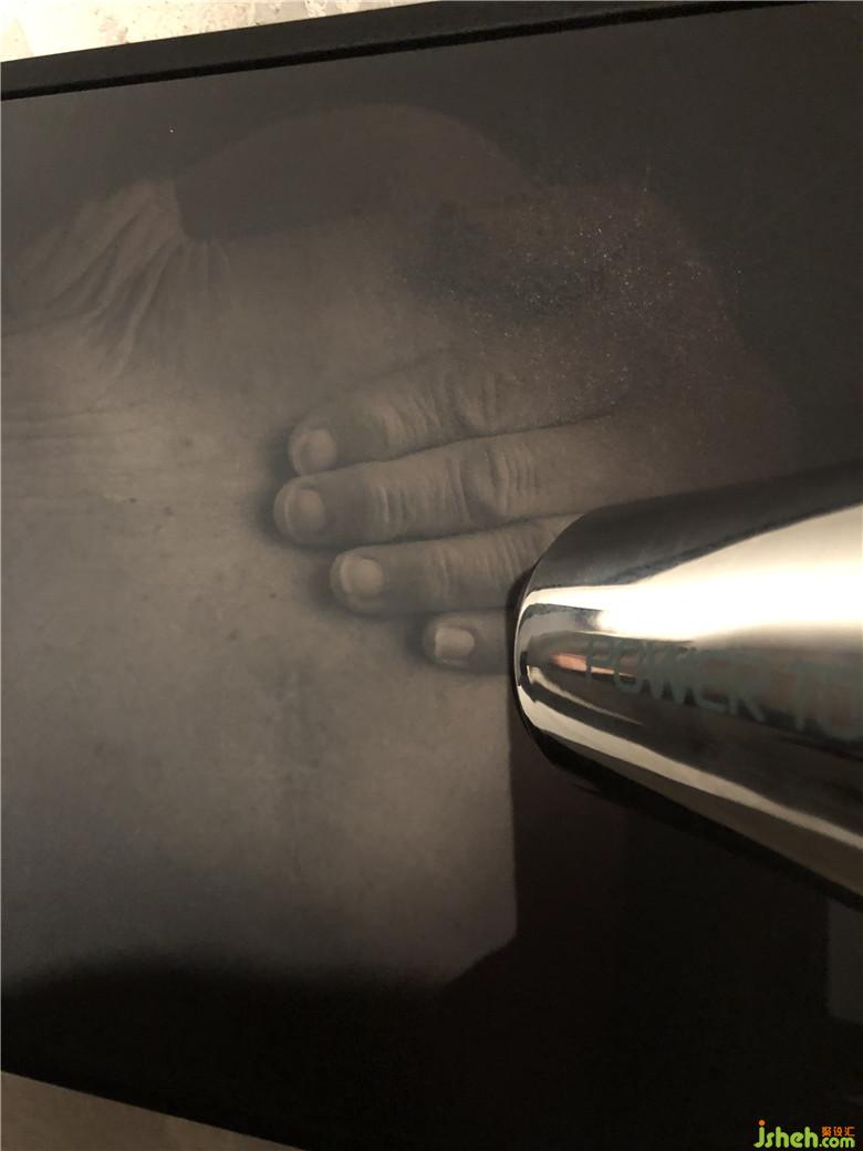 这是主题为“曝光”(Come To Light)入口处场景,墙上挂着几块黑屏板,当用吹机风吹向它时,会出现一些人体的图案,就像是为了满足人们窥私欲而被人挖掘出来。