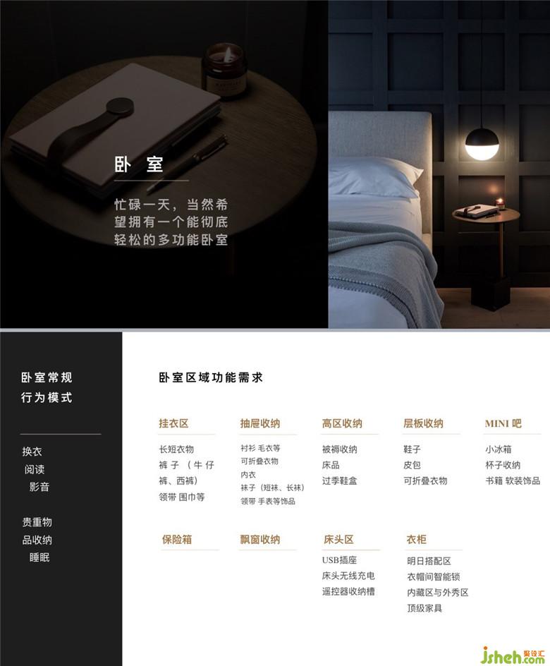 张力老师表示卧室是忙碌了一天,需要有一个温暖栖息的多功能轻松场所。需要有挂衣区和抽屉收纳,并且提出上班一族的白领重视服饰包包的展示,还需要在衣橱收纳区划分出一个可供展示衣物的区域。高层被褥和床品收纳、过季鞋盒收纳等不常用物品。层板区则可放置常用物品,如鞋子、皮包和可折叠衣物。层板金属框,内暗藏LED硬灯条,使柜内更通透。必要时需要设置指纹保险抽屉,多种开启方式指纹开锁,低功耗,三格分断,分类收纳,空间利用率大。如果空间允许,还可以设置mini吧台,让卧室的动线丰富饱满,打造一个功能齐全的卧室。床头收纳需要配备usb插座、无线充电、遥控器的收纳槽以及隐藏式读书灯等。