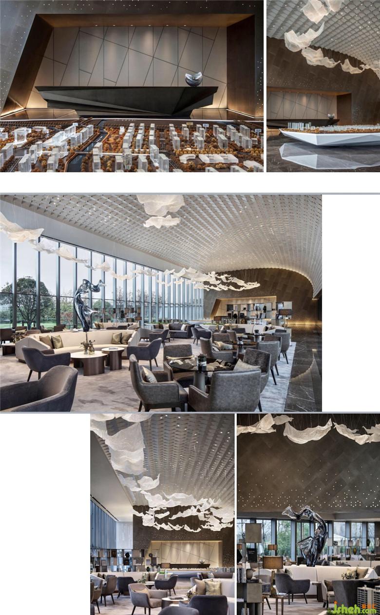 随后张力老师和我们分享了案例上海融创唐镇展示中心,张力老师着手于该空间设计的最初构想时,希望打破的是对售楼处的固有印象,探索更多的可能性,用更前端、更具话题性的表现形式,去模糊商业与艺术空间的边界。项目建筑本身拥有极具造型感和艺术性外形,希望这种原始、纯粹的张力从建筑外部延伸到室内空间。以雕塑般的造型及内部丰富的空间和光影,希望带给观者惊艳的背后是独特的空间体验。设计以精妙绝伦的造型展开,彰显建筑与自然的融合新生,詮释尊崇展厅的价值座标。在极具深度的变化中营造空间序列,前厅的第一视感是形成整个空间气质的起点,墙面与天花的立体折型设计和强烈造型感的空间结构,极具视觉冲击力。光线从墙面穿孔铝板透出,与山石吊饰造景形成独特韵味,疏影斑驳灵动。摒弃多余的陈设,以极具现代感的艺术装置去迎合空间本身的灵动,搭出极具视觉冲击力的多元层次,完成空间的艺术化表达。