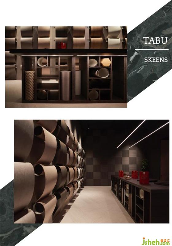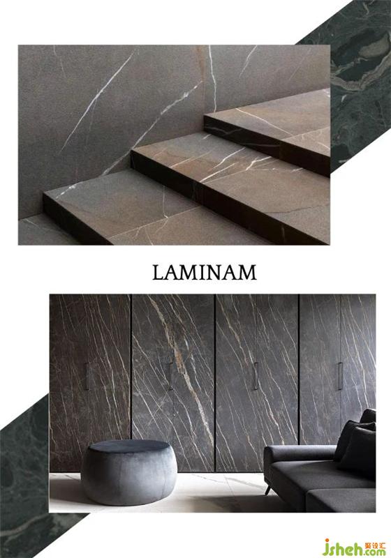 同样具有潜力的新材料还包括Tabu 公司的产品 Skeens,它的使用非常便捷——可以用在直的或弧形的墙面上,它拥有大自然或几何造型图案,且有多种颜色选择,给设计提供了非常完整的解决方案。此外,得益于前瞻性思维,一些传统材料经过技术创新也焕发新生,Laminam在石材领域革命性的创新便很好地体现了这一点,它的In-Side 技术首次让石材的表面纹路具有延续性。