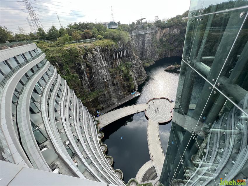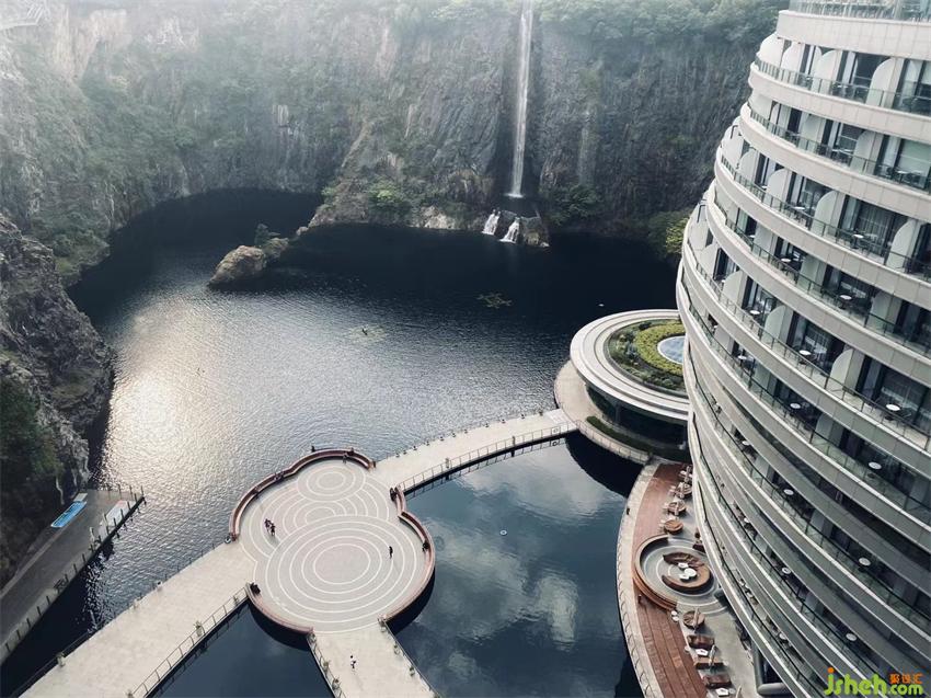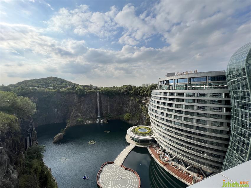 上海佘山世茂洲际酒店(又名“世茂深坑酒店”)建造于原本为采石矿的深坑之上,为了将原始深坑的粗粝质感和周围自然环境相融合,酒店室内采取“矿意美学”的理念进行设计,将原生粗犷的岩石崖壁与缥缈雅致的山水自然相结合,打造出专属于世茂深坑酒店的意境文化。