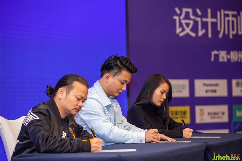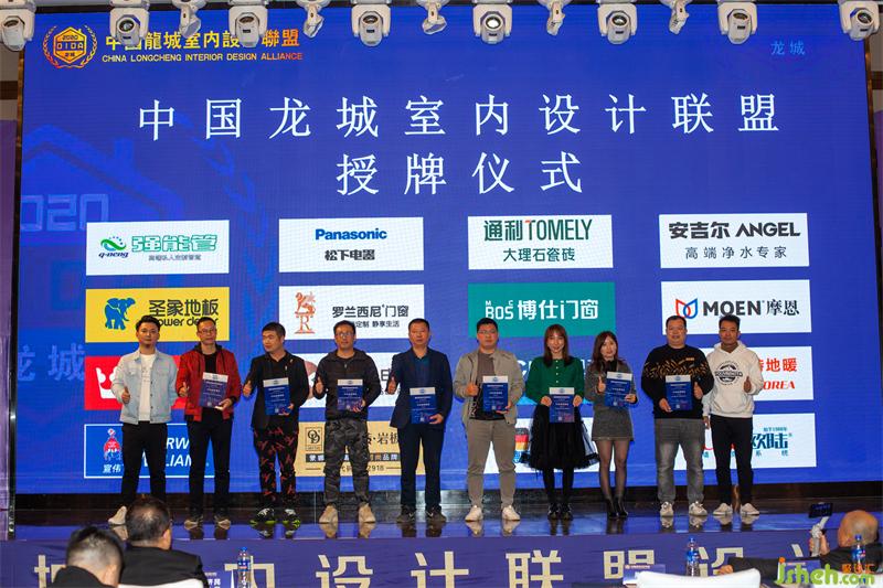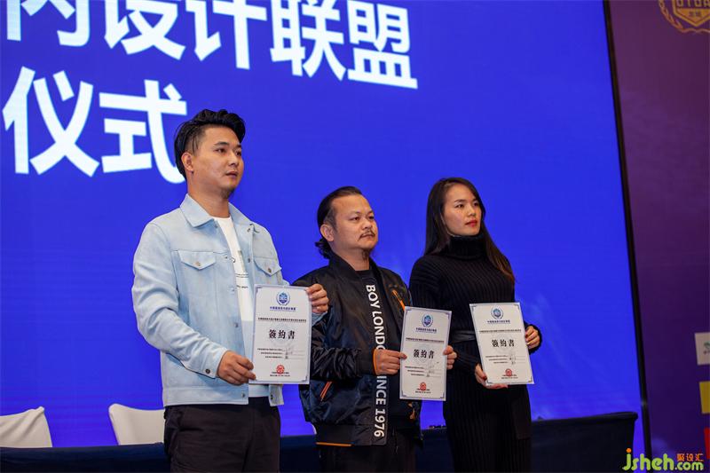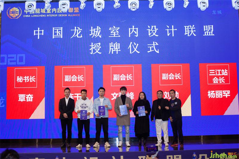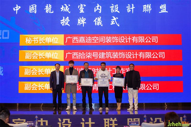 中国龙城室内设计联盟秘书长覃奋,中国龙城室内设计联盟副会长陈干,中国龙城室内设计联盟副会长文骏峰,中国龙城室内设计联盟三江站会长杨丽罕