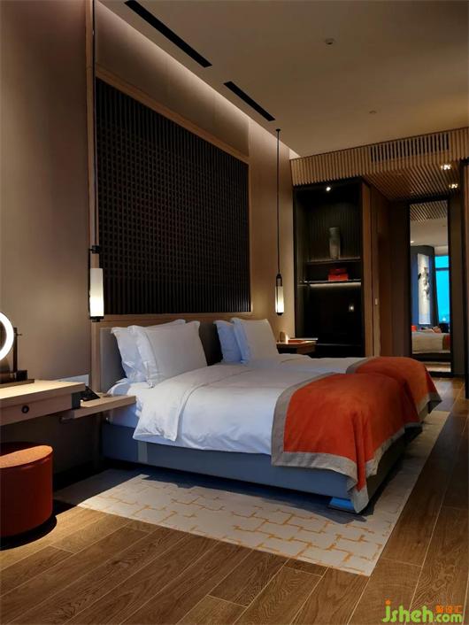 酒店套房的空间高大宽敞,大面积的落地玻璃窗将室外的自然景观引入室内,让空间得以延伸,视觉更觉宽敞。室内以原木为主导,多处运用东方特色元素,无需其他过多的修饰,尽显东方韵味。