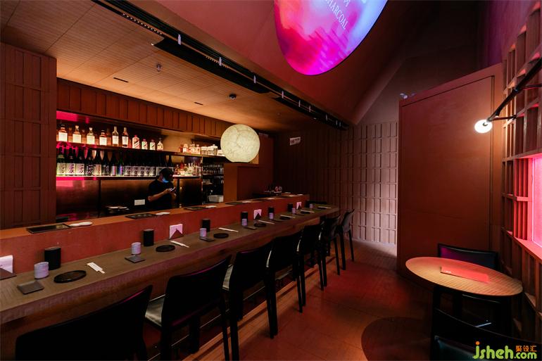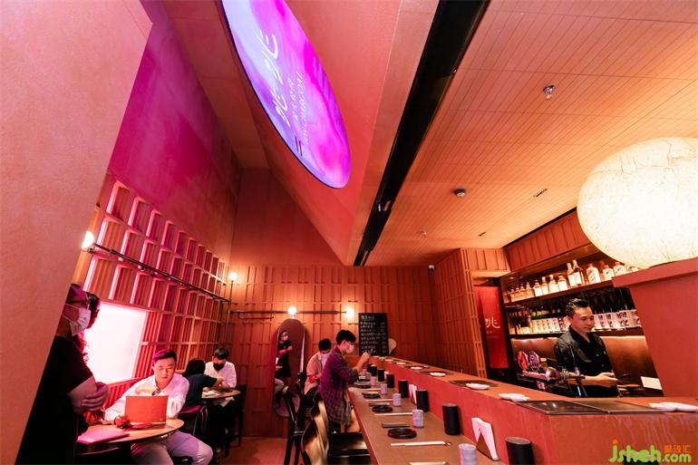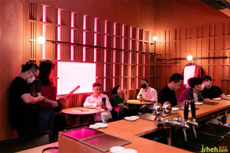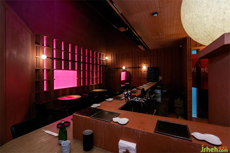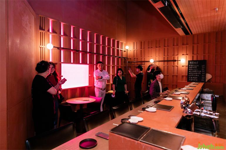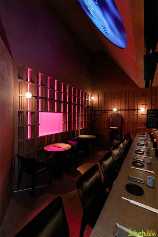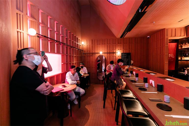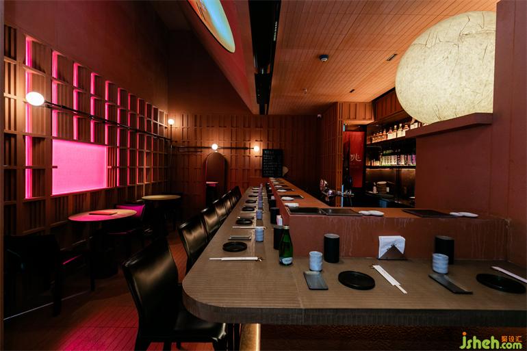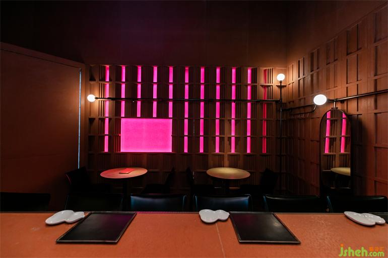 这餐厅空间狭小,共12个餐位,吧台像一把简单精致直角扳手,长柄处坐6个人,拐个角,短的一头设两个餐位。外立面墙中间有一个玻璃窗户,窗户底下左右两张桌子,4个餐位。白天光打进来薄薄一层铺在25%透明度的玻璃上,像粉红色的雾。晚上的模样我们不知道,可夜色撩人,雾色应更浓。