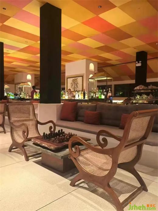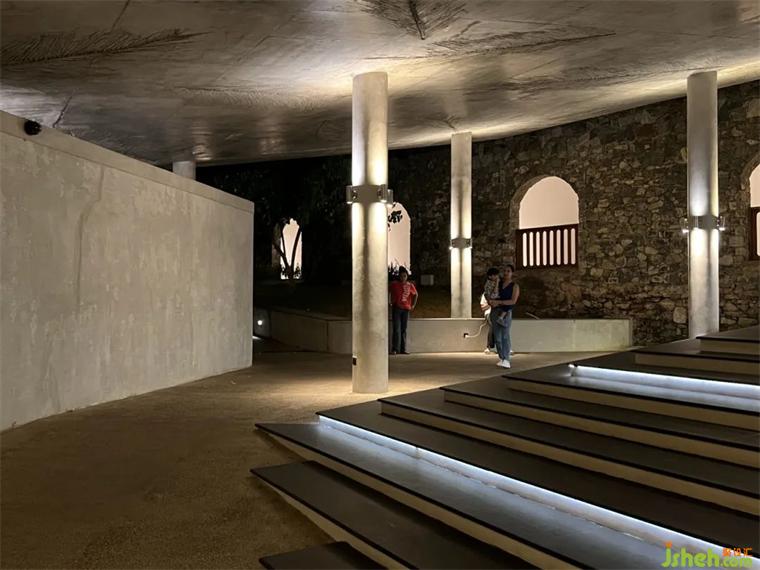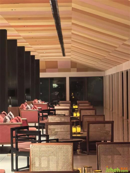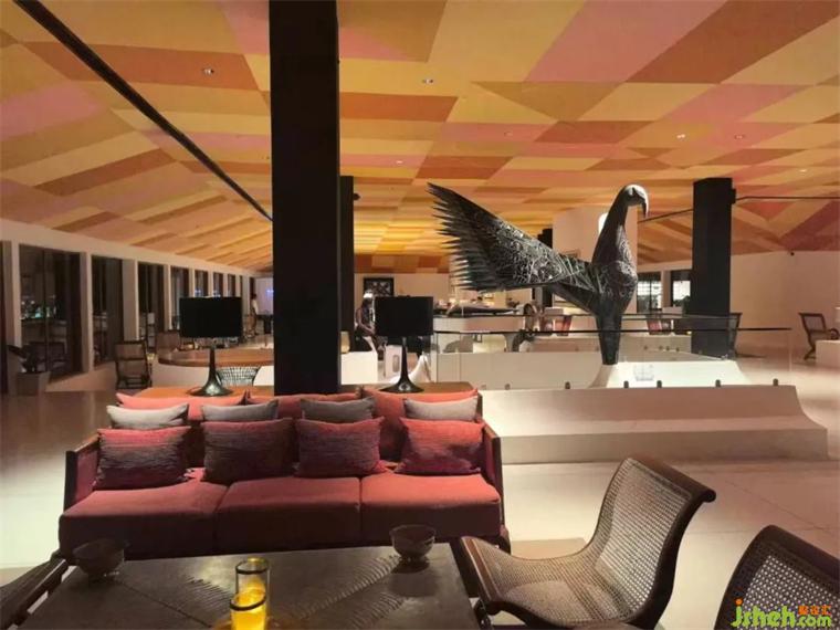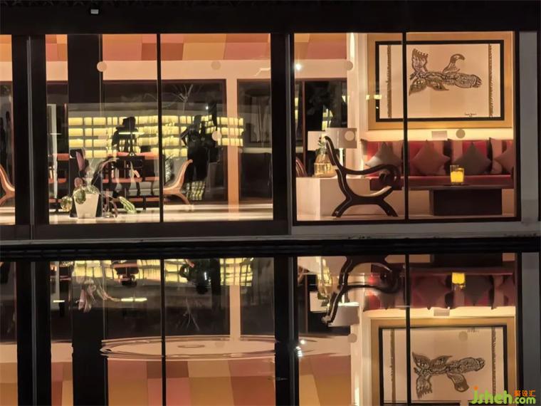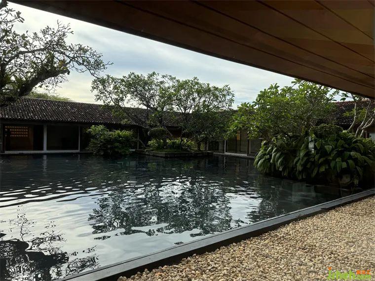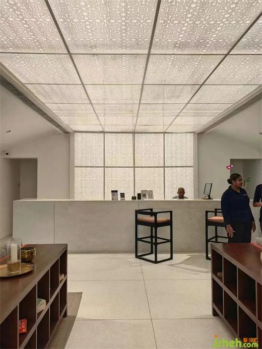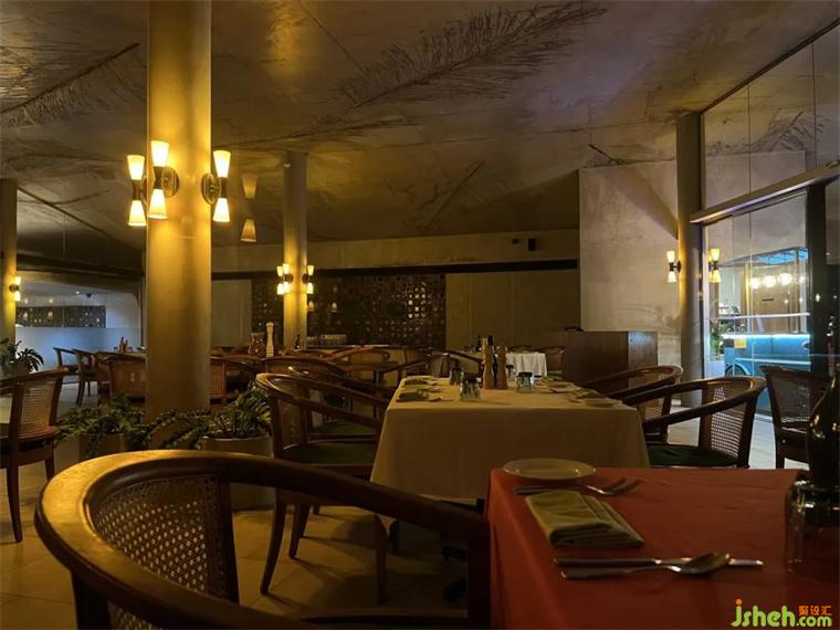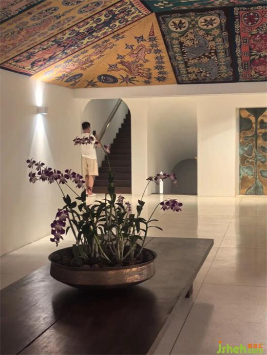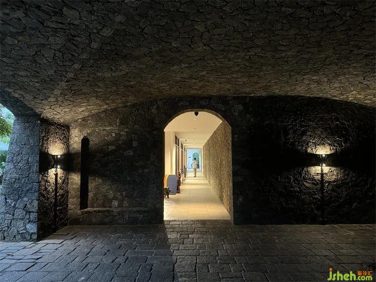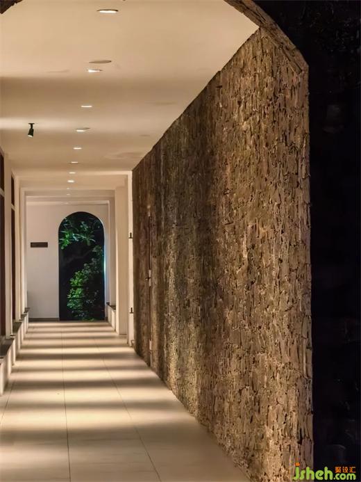 基座层是由毛石砌筑而成的“堡垒”,内部空间有种厚实的洞穴感。二层是以四面围合的水庭院为中心的公共区域,这一层的陈设设计得非常适度,繁复而不油腻。三层往上则是层层向外悬挑的客房区域,举重若轻地漂浮。装修设计