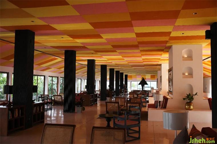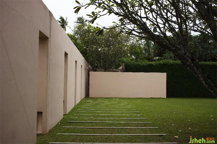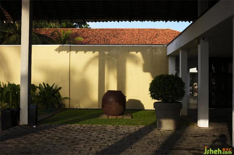 2.低成本建材运用,所有巴瓦的作品采用的材料都极其普通、便宜,室内几乎没有吊顶,墙面四白落地,地面是陶土砖、水泥地面或者木地板,没有踢脚线。照明基本采用自然光和间接照明。装修上极少采用现代材料,空间呈现出简朴、自然的松弛感。