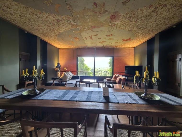 基本上他的作品里面都会有大量他自己设计的家具,以及他的艺术家朋友们的作品,具有地域性特色的木雕,以及用布印染的各种丰富多彩图案的装饰画,这让我站在面前简直挪不开眼,吵着想要导游小哥带我去买,哪里有卖,结果他说这是他朋友的作品,市面上肯定是没得卖的,那我说复制品有吗,他笑着也不知道该如何回答我,可能以前没有人提出过这样的要求。
