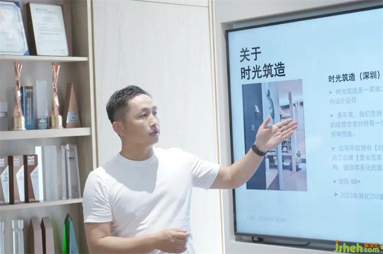 在联合创始人之一的张君老师带领下,我们参观了时光筑造的办公室,一进门,一张大大的会议桌映入眼帘,两旁的墙上挂满了过往的荣誉以及客户的照片。在 LOFT 结构中,一层景观最佳的位置都被设置为客户洽谈室,从这些细节中,我们深切感受到了时光筑造对客户服务的高度重视。这也是他们在激烈的市场竞争中,能够持续稳定地出品高质量、高数量家装设计项目的重要原因之一。