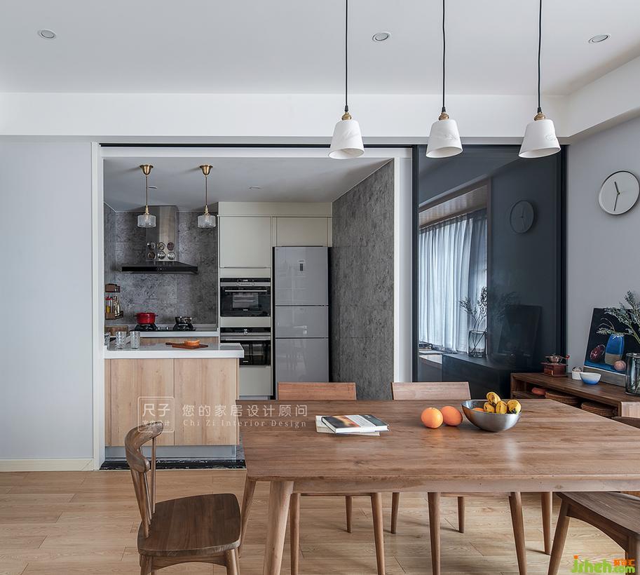开放式的厨房,橱柜是不能少的,橱柜里存放日常厨房用品,橱柜上方放置小型绿植、装饰画或者小摆件等,拿取方便,同时又能美化空间。橱柜旁贴一竖条的黑板壁纸,黑板壁纸非常灵活好用,下面摆放书桌,在厨房也可设置休闲的学习区。设计公司
