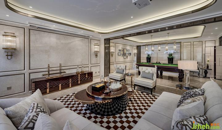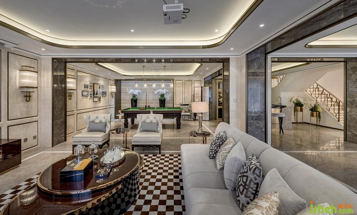 作品简介:整体的风格是现代法式的风格,把古典的精神,如对称,轴线等,包括古典线板和门套的做法,都融入整个设计中。在古典的别墅装修设计理念上想做一些突破,所以在呈现的元素上做一些新的想法。在设计中,墙面的护墙板还是用欧式的做法,但是把古典的线条简化了,用一些现代的材料,比如不锈钢的材质来勾勒出护墙板的线条,让古典元素不流失的同时也有一种现代感的展现。