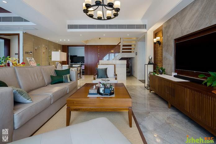 本案室内设计师采用现代中式的空间设计手法,运用中式独有圆润的元素符号,放大于室内空间,在空间序列上贯穿一条主轴线,层层递进,一步一景,形成一府、一院、一园的空间格局,浅浅温暖的色调平静人心而柔软温和。