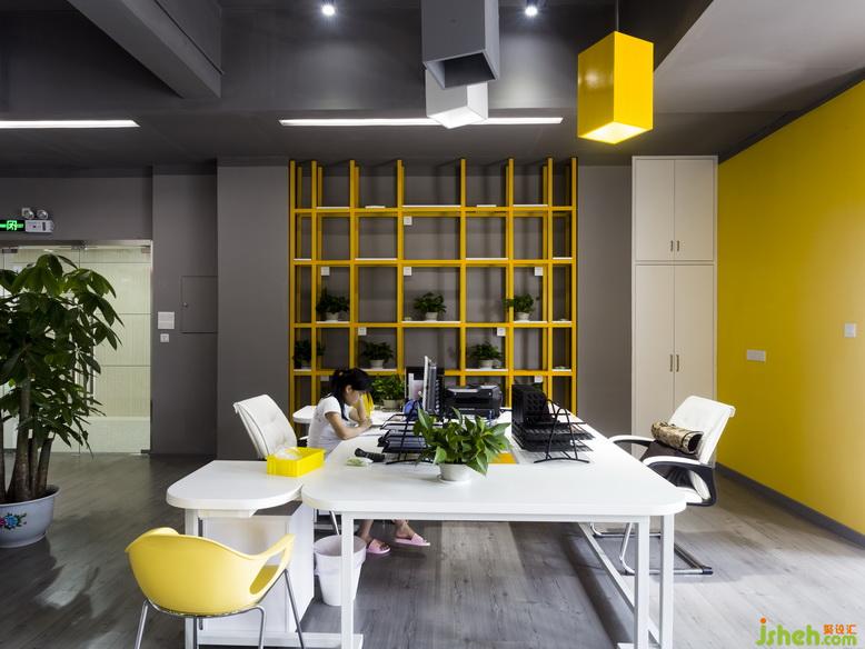 作品简介:办公室可谓是员工的第二家,是我们一天中主要的活动场所。所以好的办公室应该是灵动赋予朝气的,因此本案就采用了银灰和明黄的搭配 ,强烈的色彩冲击不仅空间上给人以视觉延伸感,更是一种感官刺激,在这样的环境里,不易产生困倦感。红色的时钟装饰,别具一格又不突兀,是空间颜色的填补,也是一种隐晦的警示。随处可见的绿色植物,是装饰,也是对员工健康的保护,工作之余欣赏盆景,不久舒心养性,也缓解了眼部疲劳。再者是空间上的巧妙,没有过多的墙面束缚,排列也不尽规则,加上用明艳的黄色来分割,完全开放式的办公,办公场景中咖啡台、实验室、公共办公区,相互的互动,休闲与办公相结果,这样不仅弥补了空间范围的不足,使空间更加通透大气,也更有利于员工思绪的飞扬。让每一们员工都恋上如此舒适办公环境。