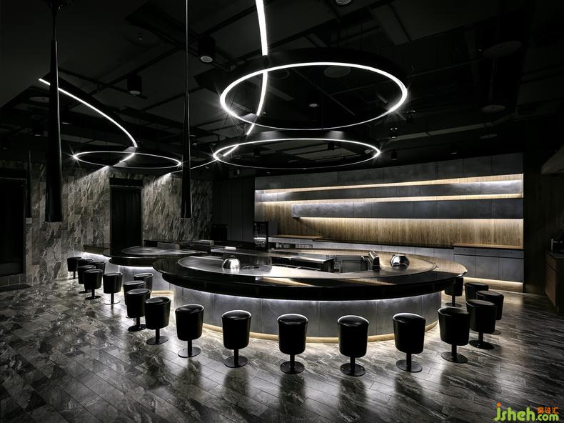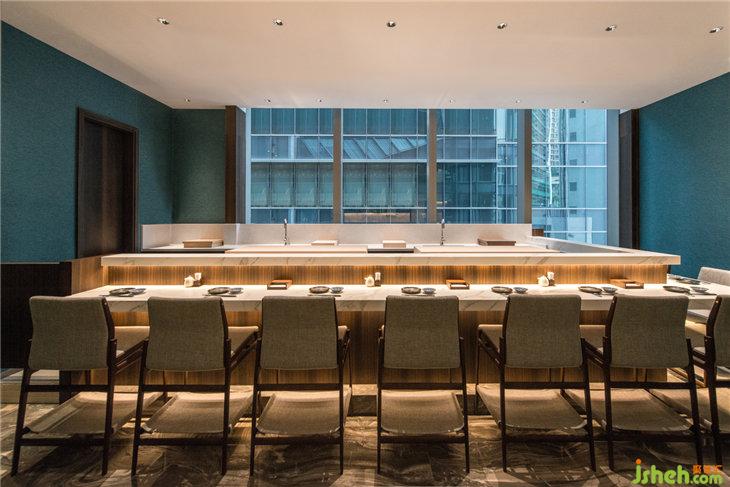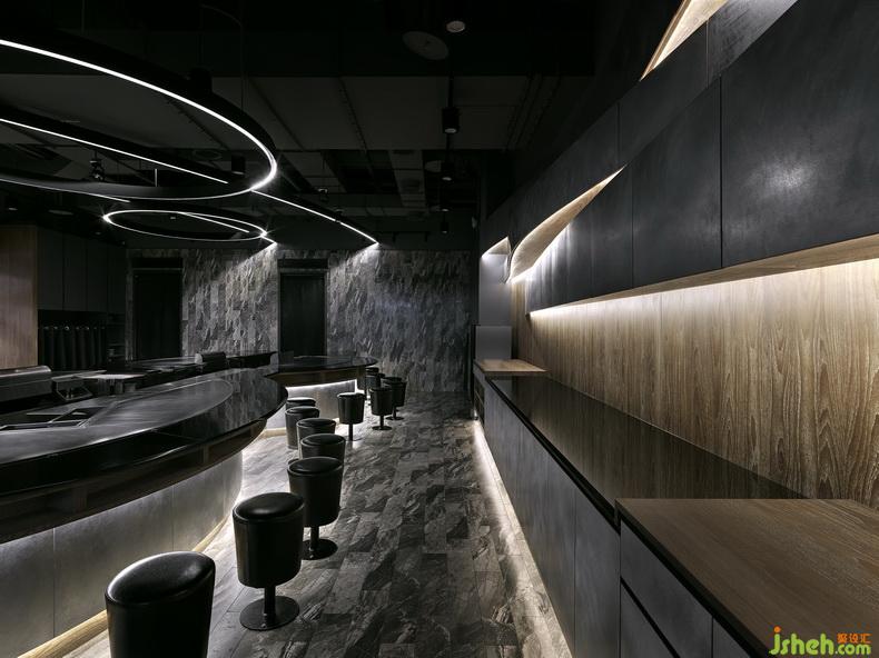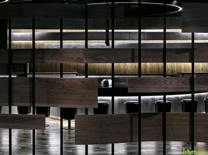 作品简介:打破以往人们对日本料理固有的形象,设计师以现代简约为基调,注入隐晦的日式传统文化元素,棕色、蓝色与黑色作为空间的主要基调,有别于传统日式料理餐厅的米白色调。