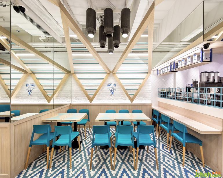作品简介:门面设计以类似的木材为主题,外卖窗口则以金属邮箱为点缀。室内设计师在餐厅的尽头摆放以清镜饰面的储存柜,一来可避免观感凌乱,二来又可给予空间无限延伸的感觉。