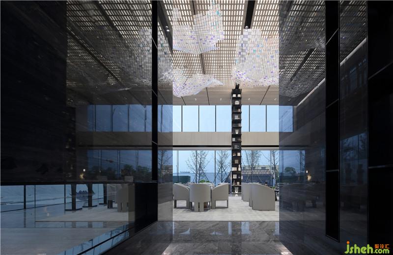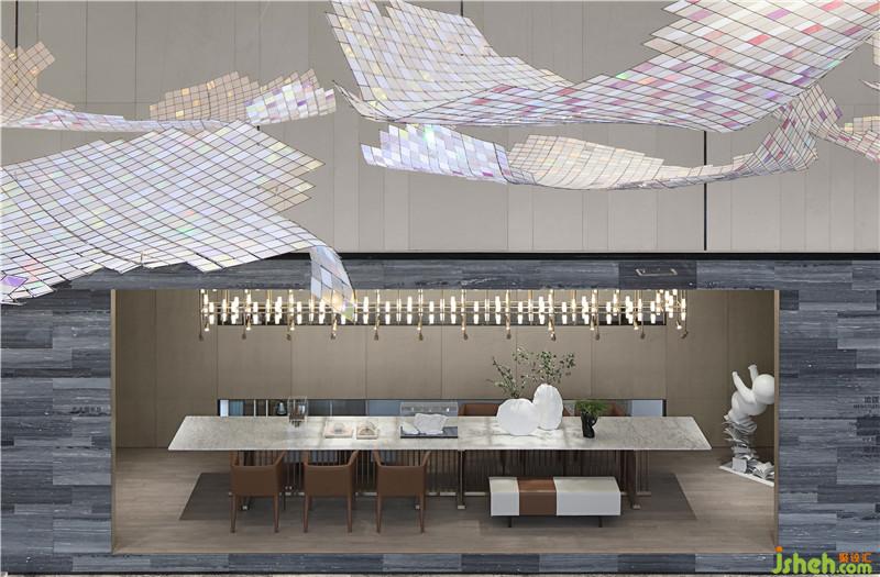 作品简介:城市星光璀璨 月与星辰丨掬水流光的后现代寓言 以后现代美学叙事,通过日月星辰的光辉聚合和建筑空间的流畅演绎,刘荣禄勾勒出时空的韵脚,折射新生活哲学的未来之境。 大厅借由自然光线和建筑线条的铺层,提炼空间结构,与金属材质造型的丰富层次,幻化出光的场域。让人置身其中,一步一景色,俯拾之间即见日月星辰。利用光影照度,把控空间的节奏和温度。灵动的线条仿佛漂浮的流云,在钢筋水泥之外呈现翩跹云上的意境。